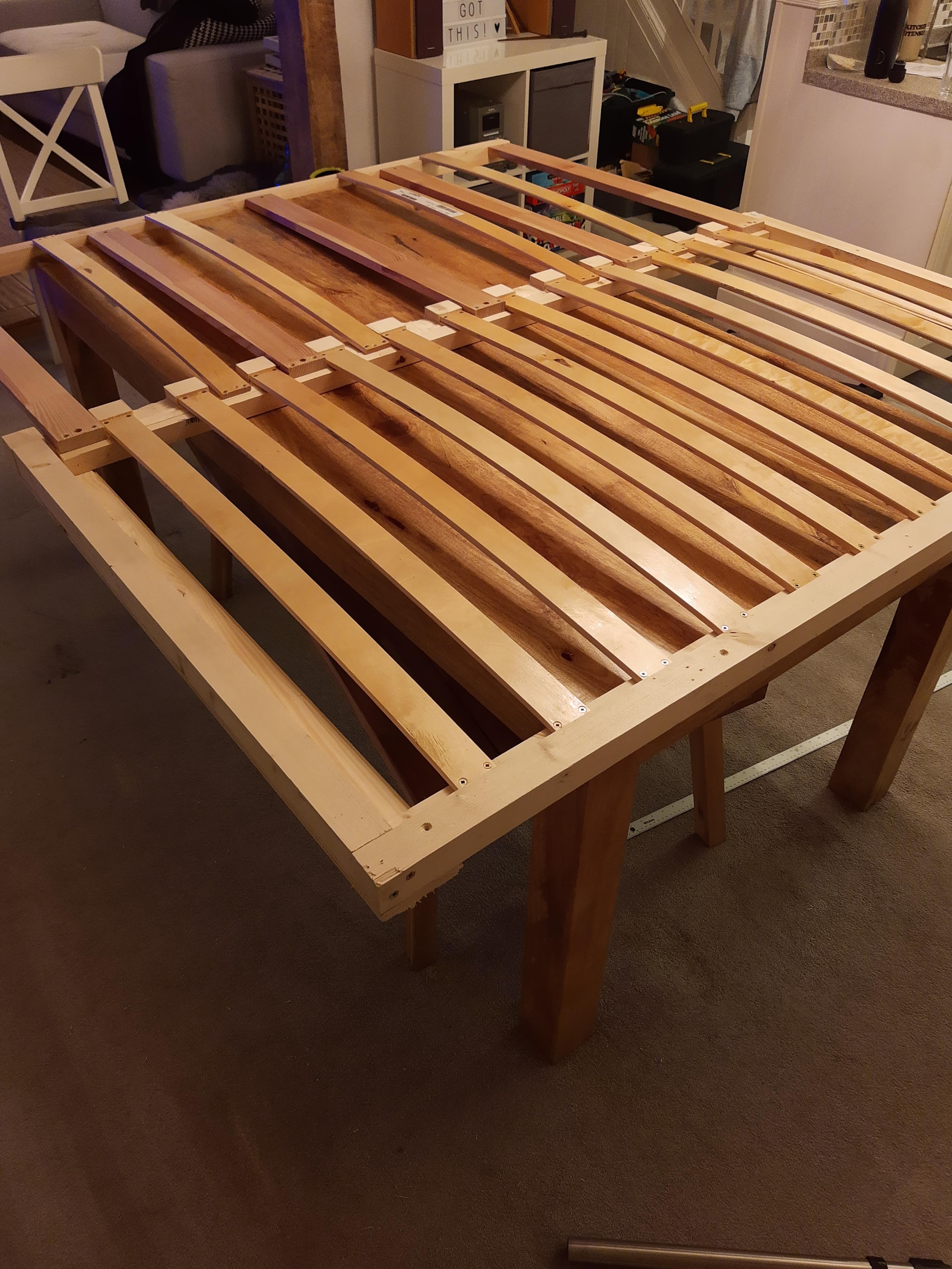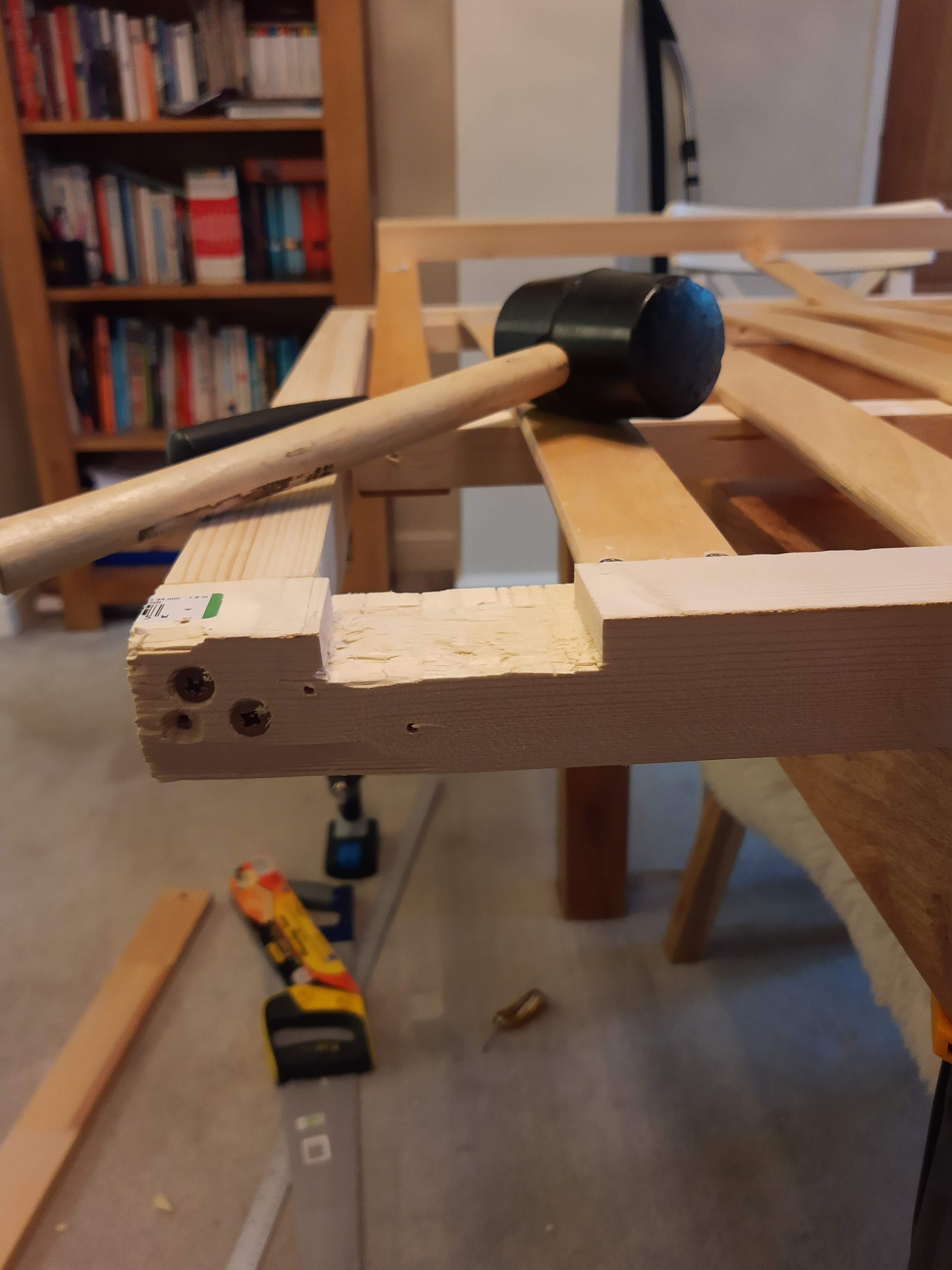 Build a bed frame like a single bed so if one person is using it they can sleep on this width ways IF they are 5ft 5 inches or smaller; then have a sliding part for taller or more than one person. We found that the sliding part snagged approx 4 inches from full extension so we couldn’t achieve the length we needed. We decided to castellate the frame to allow for full extension. With the advice from a friend (Craig – shout out!) we decided on old school hand tools – chisels, tenon saw and a rasp. 104 cuts, lots of chiselling, finishing and a lot of sweeping up and hoovering later we achieved the look below (pictures 1 & 2 below) We have 4 more slats arriving later this week then we’ll set about installing into the van.