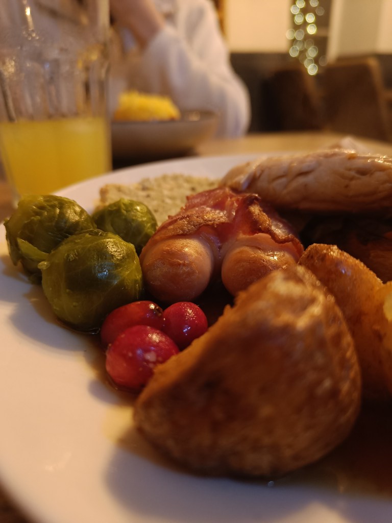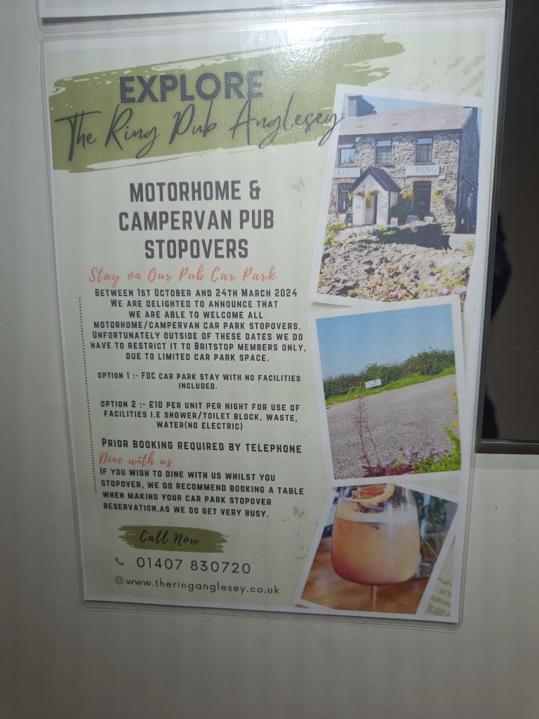 We headed to https://www.theringanglesey.co.uk/ W63 in the Brit stops guide. We walked into a lovely cosy pub with a fire, were welcomed by a lovely guy, and asked about a Britstop stay, they confirmed we could stay over and if we wanted the use of the facilities for an extra £10 – drinking water fill, grey water disposal, toilets, and showers which we did. The pub was quite busy but they had space and we grabbed a table for two, they had their festive menu on – 3 courses for £28.95, 0% Guinness available, and a free bookshelf for a small donation. Aimee found a VW Campervan book (meant to be). The host – wasn’t very attentive and friendly, the service was fantastic, we treated ourselves and ordered three courses – prawn cocktail, full turkey Christmas dinner, and Christmas bread and butter for me; soup, vegetarian chili, and churros for Aimee. We talked, we chilled, we ate, we drank – the whole bill with drinks and the stop-over with use of facilities was around £80 which we thought was great value considering the quality of the food, service, and surroundings. We also got a voucher to use the next time we come back which could be anything from 10% off to a free meal.